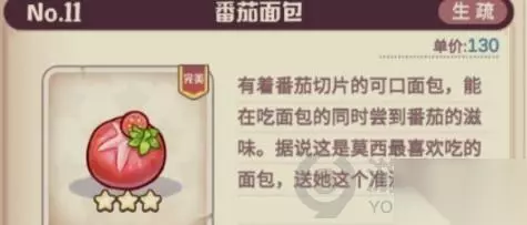 诺弗兰物语番茄面包怎么做 1、具体配方:我们在游戏里要合成一个番茄面包的具体配方素材有:甜味黏土5+火结晶2+黄金小麦1+血浆果1; 所以我们在研发番茄面包之前,需要准备好大量的甜味黏土、少量的火结晶,少量的黄金小麦和血浆果; 2、配方描述:有着番茄切片的可口面包,能够在吃到面包的同时,尝到番茄的滋味,据说这个是莫西最喜欢吃的面包,送她准没错;它的单价是130,属于山地类型,是一个三星的配方,编号是NO.11。