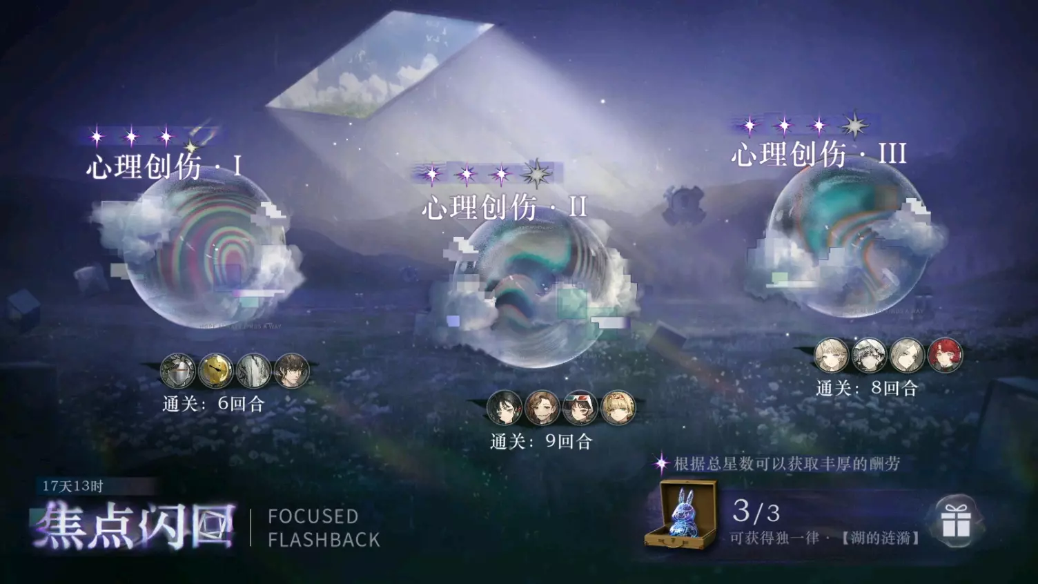 这是一篇游戏《重返未来:1999》的攻略帖,分享了以乌尔里希、未锈铠为核心的配队,在焦点闪回无哑谜关卡中达成满星的配置与思路,该配队有稳定流程轴,目标是6回合内击败流逝的沉眠。