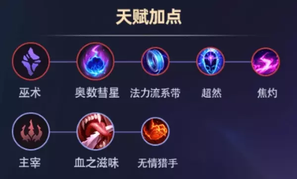 主:主宰-黑暗收割 血之滋味 眼球收集器 贪欲猎手 点评: 1、黑暗收割火男的装备起来之后黑暗收割配合眼球收集器,伤害是非常恐怖的, 2、另外点了一手贪欲猎手增加自己的全能吸血,用于对拼回复血量。 副:巫术 法力流系带 绝对专注 点评: 1、火男对线时技能蓝量消耗较快,法力流系带用来给火男回复蓝量; 2、绝对专注用来提升技能额外伤害。 点评: 1、黑暗收割与彗星玩法,都是不错的选择,黑暗收割后期的伤害会更高一些; 2、彗星玩法在前期的消耗中效果不错,但是黑暗收割可以提供更多的吸血效果。 备用天赋推荐: