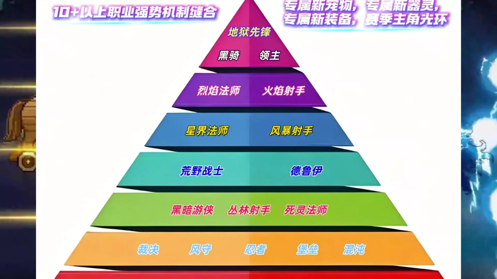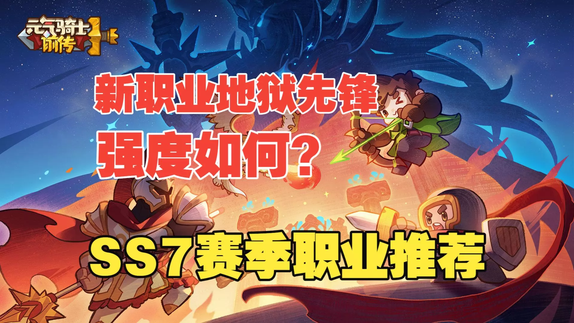 这是《元气骑士前传》SS7赛季的职业推荐内容,由SS6赛季烈焰法师榜三玩家带来。新职业地狱先锋需黄金勋章获取,风暴射手等职业可用蓝币购买,还给出了新职业的开荒流派推荐,同时展示了爬塔形态。