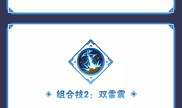 一技能划任意形态的二技能可释放组合技:双雷震,卡卡西快速突进抓取敌人,随后连续斩击敌人升空并留下雷点轨迹,最后凌空劈下一击将雷电切开。结束后获得短暂的雷切苦无强化效果。