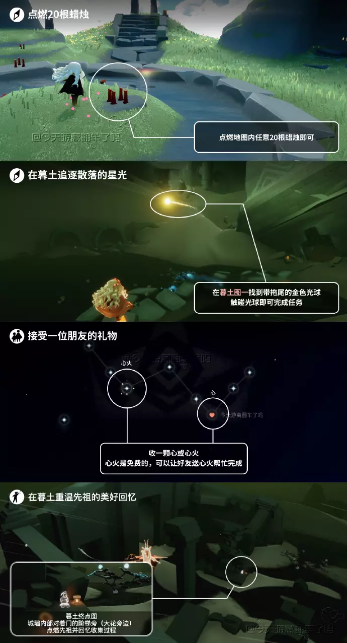 《光遇》游戏中每天的每日任务及大蜡烛的位置都不相同,玩家完成每日任务及收集大蜡烛都可以得到丰厚的兑换奖励,奖励可以用于兑换各种动作及道具,不过很多小伙伴不知道每日任务怎么做,又懒得自己去找大蜡烛的位置,我们汇总了每日任务的完成攻略以及蜡烛位置,一起来看看吧!