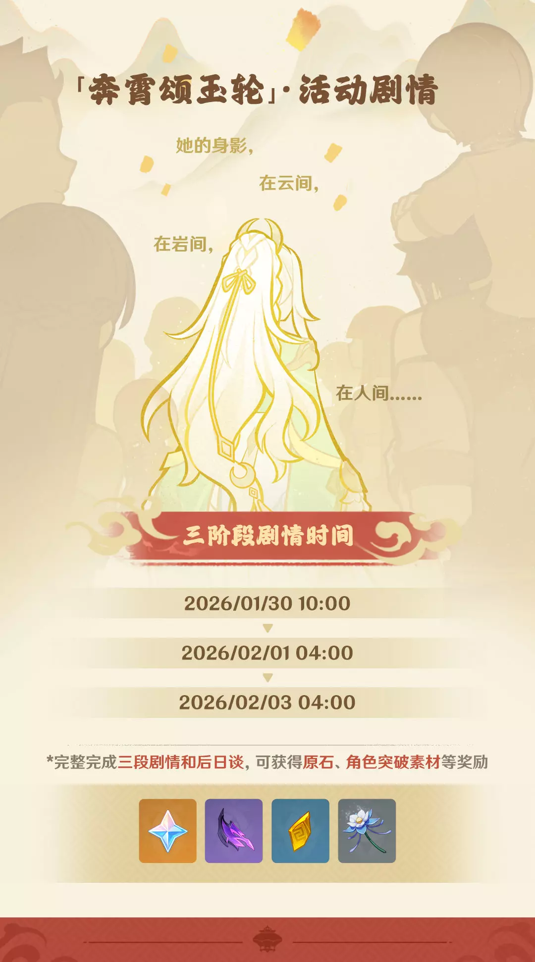 「奔霄颂玉轮」活动及剧情将于2026/01/30 10:00开启,旅行者参与其中可兑换瑶瑶衣装,自选邀约璃月4星角色,还可获取原石、智识之冕、室外摆设等奖励~