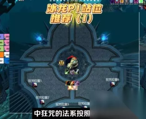 2、P3的站位跟P1比较相似,如图所示。被点名保住的人第一个去右前,第二个去左前,团队找好打兵救人的节奏,根据DPS的情况决定救几块兵,以后全力输出BOSS。这里有一个细节需要注意,第三阶段的狂咒千万不能叠层,必须看好狂咒点名之前,要停手或者做好断条的准备,因为此时全团必须集中站位消密法打击。狂咒叠层以后单独出去炸,加上密法打击中伤必然会死。而不出去炸的后果呢,是全团增伤后的伤害压力非常大,很容易团血崩。所以解决办法就是一个P3法系严格控制不要叠任何一层狂咒就好了。剩下的就是根据团长的指令转火好冰打掉BOSS就可以了。