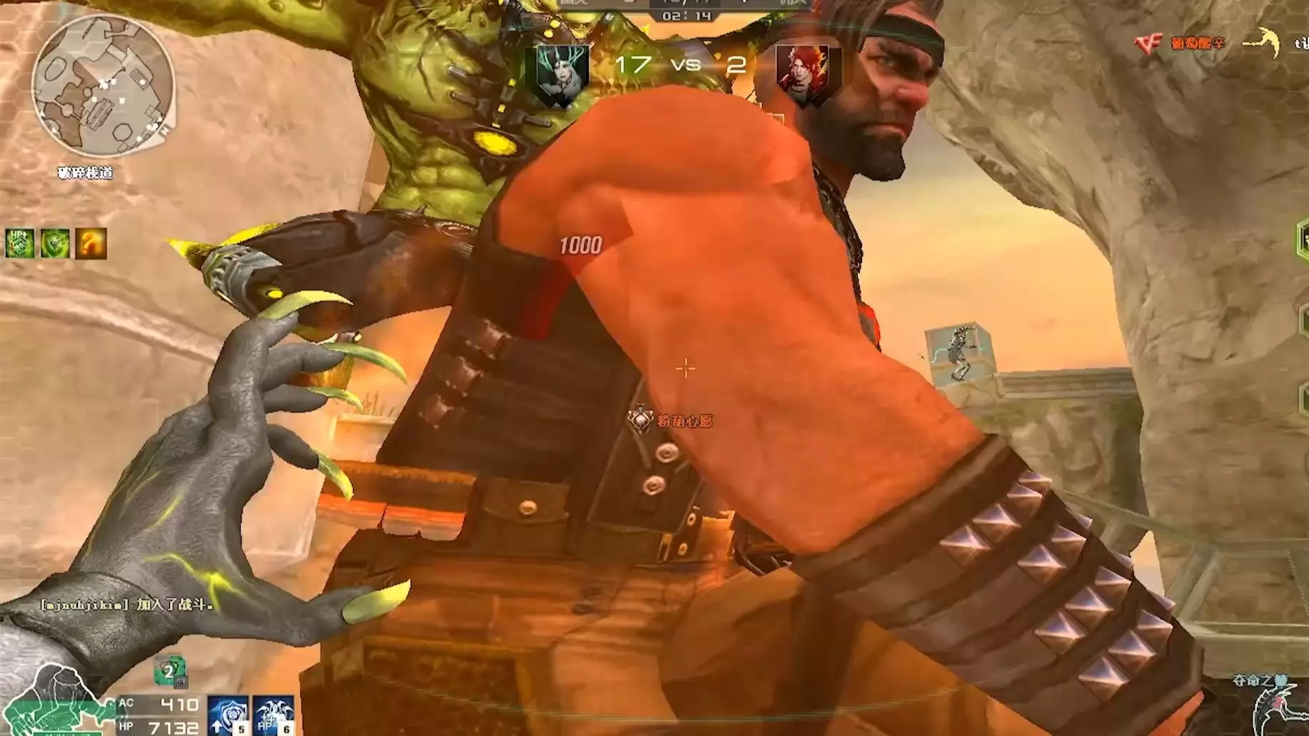 这是《穿越火线》生化模式的游戏画面,展示了佣兵与幽灵阵营的对战场景,能看到不同幽灵角色的战斗状态,还有角色的健康血量数值显示,呈现了该模式下的对战过程。