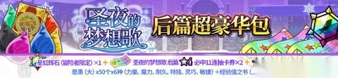 礼包2:圣夜的梦想歌 后篇特别包 600收费虹水晶 仅可购买3次 礼包内容:圣夜的梦想歌 后篇★4必中11连抽卡券*1、圣夜的梦想歌 后篇11连抽卡券*1、★4必中抽卡券*1、征服的恩惠*10、恩惠大*50个*6种力量、魔力、耐久、特技、灵巧、敏捷、经验值之书上级*50个。 礼包3:圣夜的梦想歌 后篇纪念抽卡券 100收费虹水晶 仅可购买1次 礼包内容:圣夜的梦想歌 后篇11连抽卡券*1。