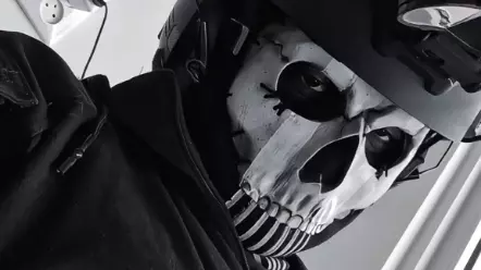 这是一组模仿《使命召唤》中幽灵的cosplay内容,戴着骷髅面具的coser做出神态动作,配文玩梗,表现出“闻起来很棒对吧”的趣味互动,展现了骷髅面具cos的独特魅力。