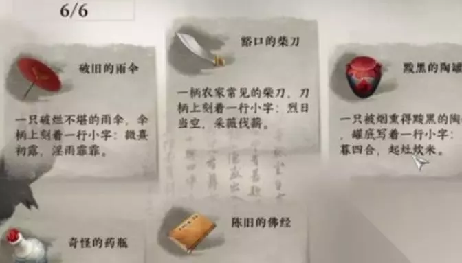 线索解谜 打开收集到的线索进行解谜。雨伞的提示"微熹初露,淫雨霏霏"代表早上下雨,五行属水;柴刀的"烈日当空,采薇伐薪"表示中午砍柴,五行属木;陶罐的"日暮四合,起灶炊米"是傍晚做饭,五行属火。瓷碗、佛经和药瓶上的提示则需要计算数字,最终得出密码是数字163,五行顺序为水木火。