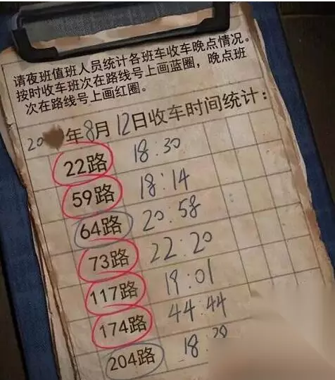 9、我们下车看公交运行时刻表就可以计算末班车到站时间,在小破屋门口凳子上,对比实际到站时间计算出计划到站时间,根据提示给每辆车画红圈或蓝圈,房门即可打开。