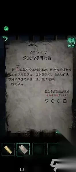 8、我们打开手提箱拿出背景介绍以及线索:上中上下下上,还有蜡烛,红笔,打火机,再去车头按公交司机按钮,上中上下下上,车头车灯就会亮起,我们下车去小破屋那。