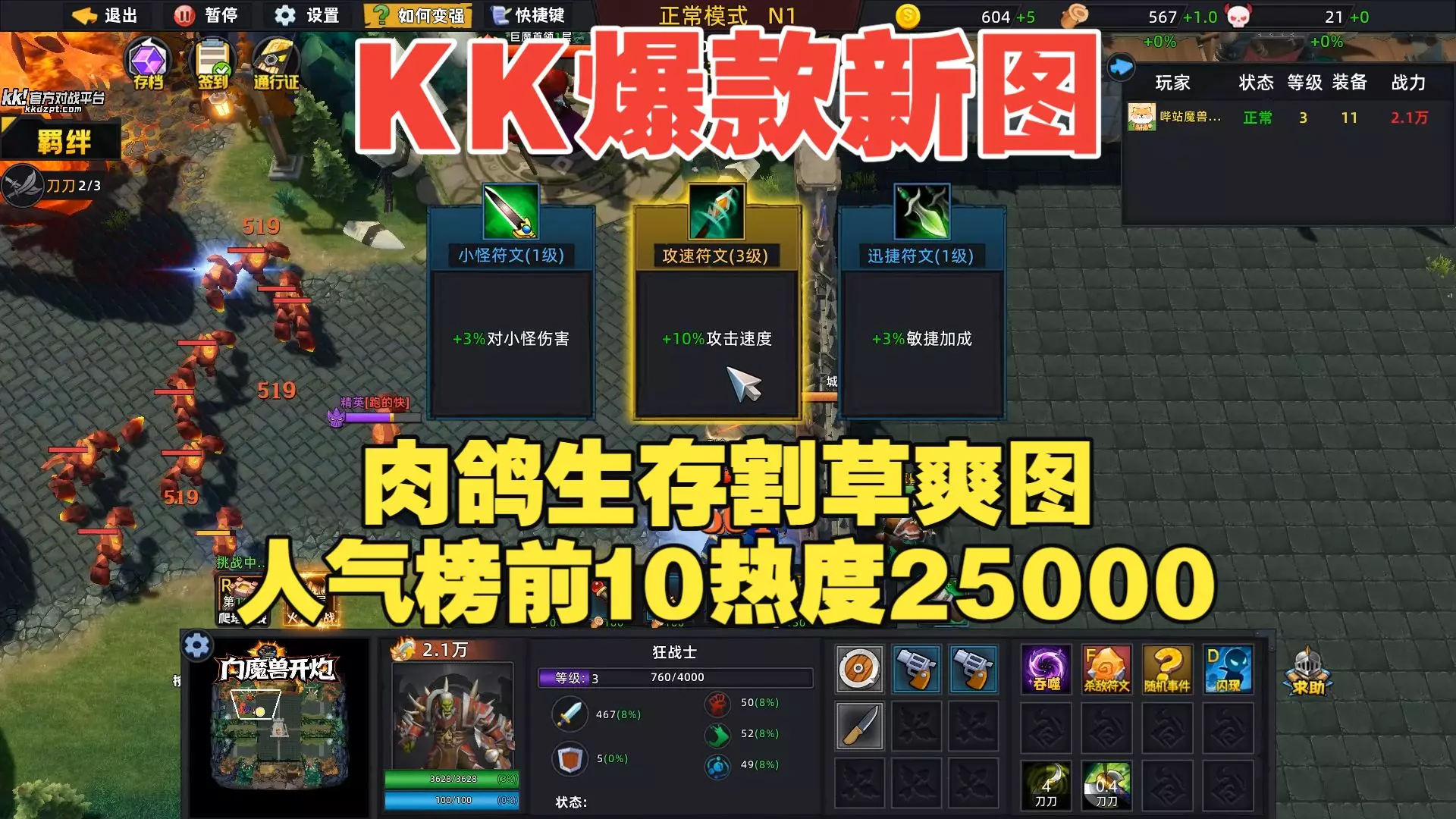 KK对战平台搜《向魔兽开炮》建房即玩 极致随机:英雄、装备、各种奖励全随机,每局体验完全不同,肉鸽爽感拉满 羁绊组合:3 名同名英雄即可激活羁绊,技能可继承叠加…