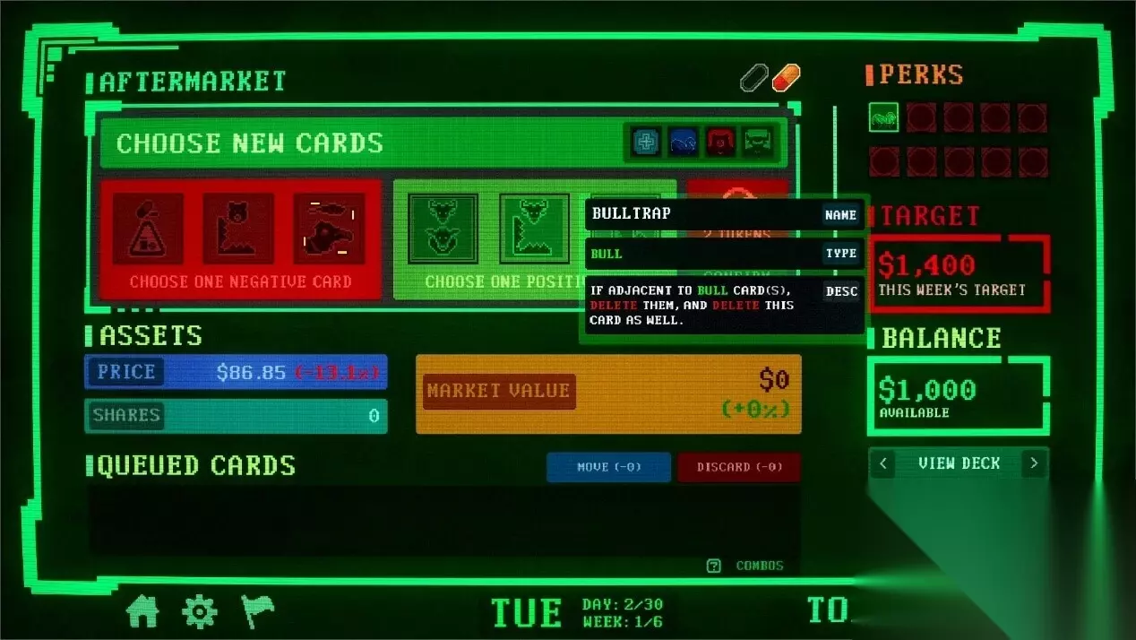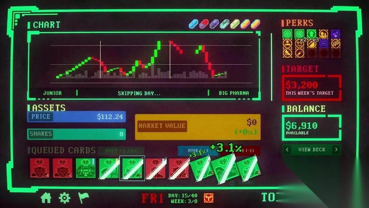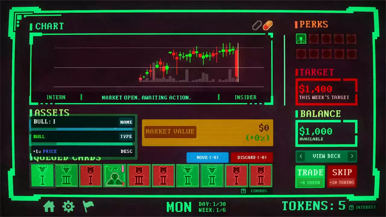 · 赢了也未必安全: 价格上涨会解锁更强效果与更高回报,但同时也让市场更难控制。许多失败并非因为运气差,而是因为把“成功”推得太过头。· 改变规则的角色: 每名角色都拥有独特的初始牌组与机制,从第一回合起就会改变你对风险、控制与波动的处理方式。· 每局都有变数: 事件、增益以及一次性消耗品会在中途大幅改变局势,迫使玩家在策略不再如预期运转时迅速调整。· 只为高风险而生: 可选的高难度模式会收紧容错并加重惩罚,奖励那些懂得何时放慢、何时任由市场崩盘的玩家。