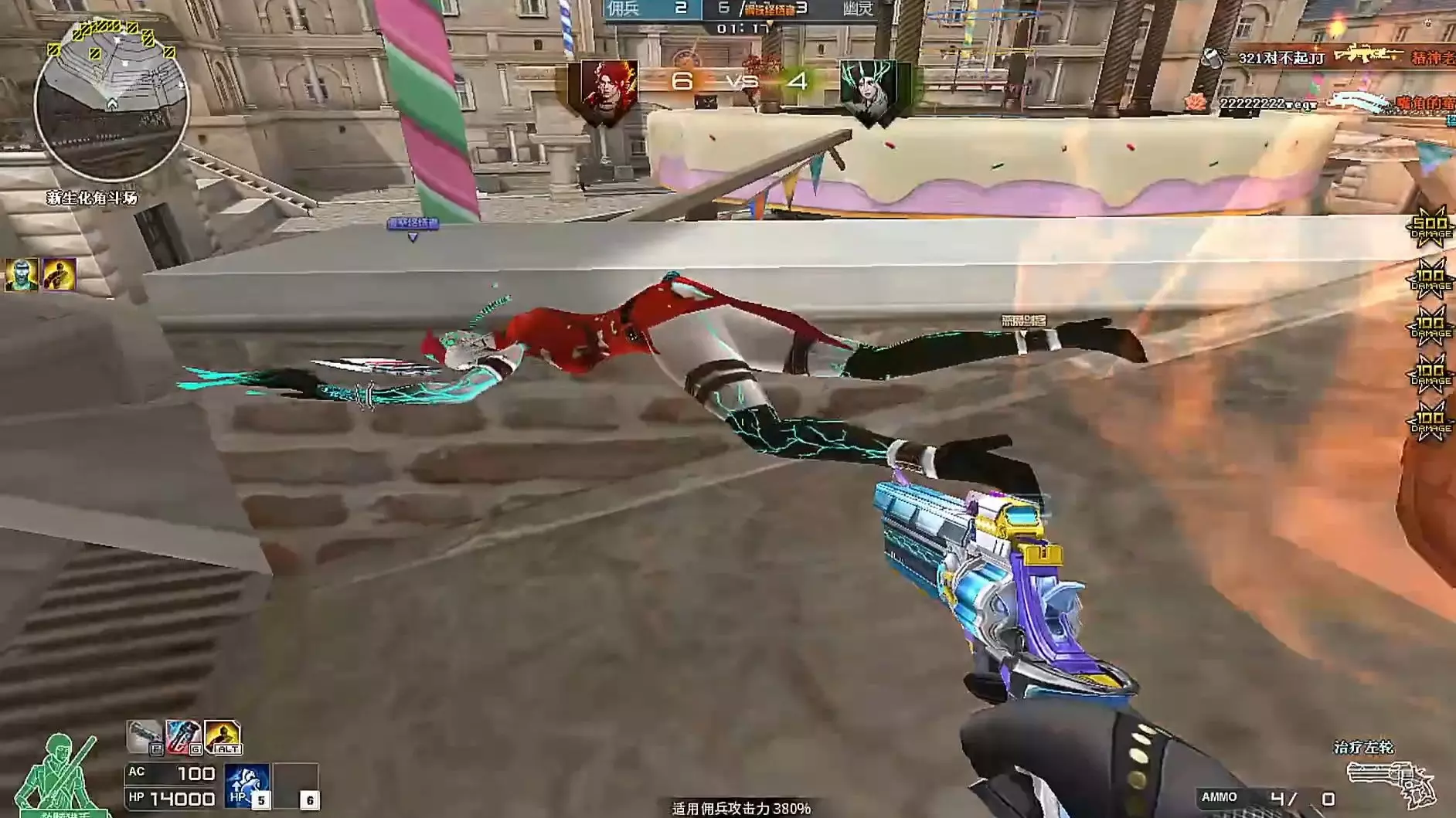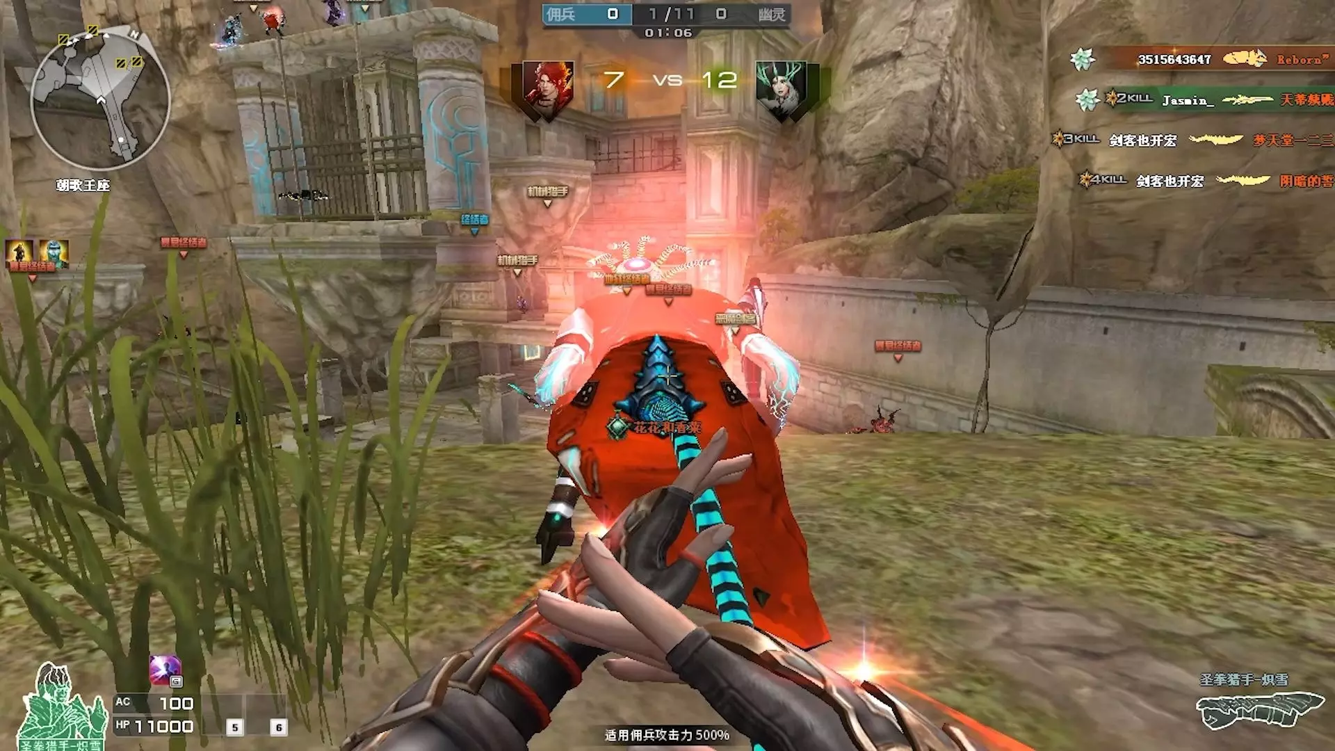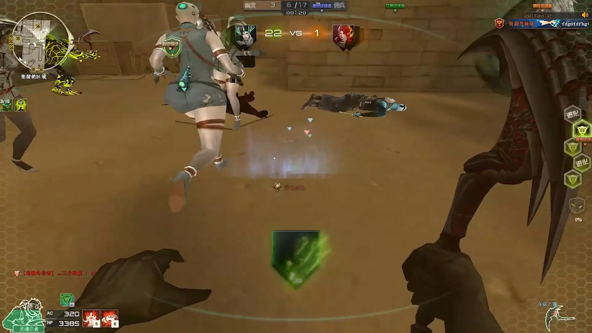 这是《穿越火线》生化模式的游戏画面,玩家分别使用装甲终结者、幽灵猎手等角色在地图中对战,画面呈现了幽灵与佣兵阵营的对抗场景,还有强化宝箱等游戏元素。