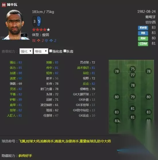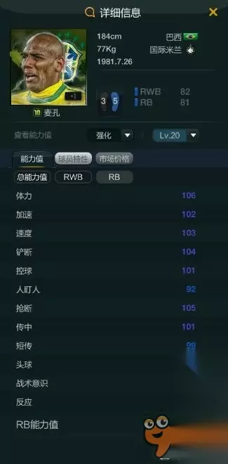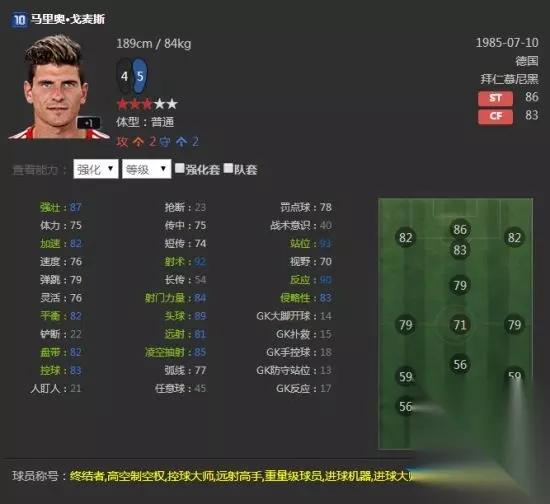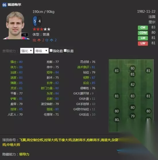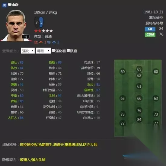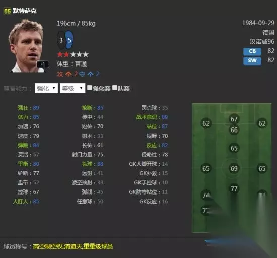 实用性非常强的球员,边路传中很亮眼,33倾向也是少见,高体力足矣支撑全场,远射与头球俱佳,除了双速一般外没什么缺点,性价比很高,前场位置都可以打,推荐右边锋。 06U博德梅尔