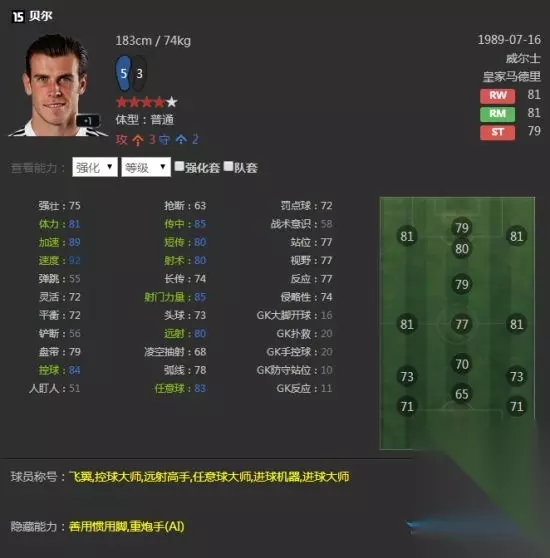 魔笛在中场和前腰位置上的表现都非常出色,数据虽然算不上华丽,却往往能够力王狂澜,两个隐藏能力也是非常出色。 15贝尔