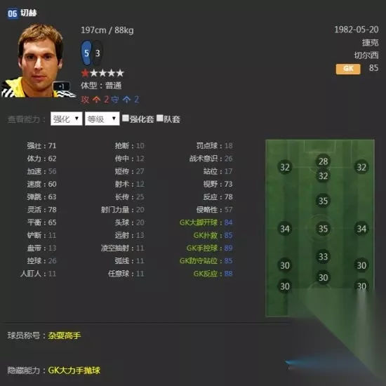 他的能力得到了很多玩家的认可,在经理人模式中也同样如此,防守端很稳,进攻中尽管没有强力头球,却也经常上演头球破门的好戏。 06U切赫