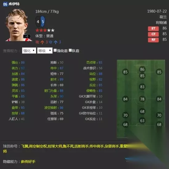 说到这里就不能不提C罗,在经理人中普卡也有着出色的表现,尤其是在ST的位置上,打双前锋C罗的特点更是完美的释放,C罗的3卡在5000万左右,对于普通玩家来说能够承受。 06U库伊特