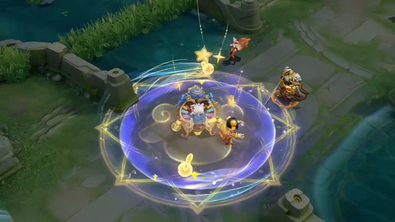 ◆三技能:铺展星光织成的捕梦网法阵,丝线牵动的星星叮当坠落,技能持续期间,蔡文姬身周虹色星石纷飞,车座下酣睡的星星和小兔子们轻轻打起了呼噜。