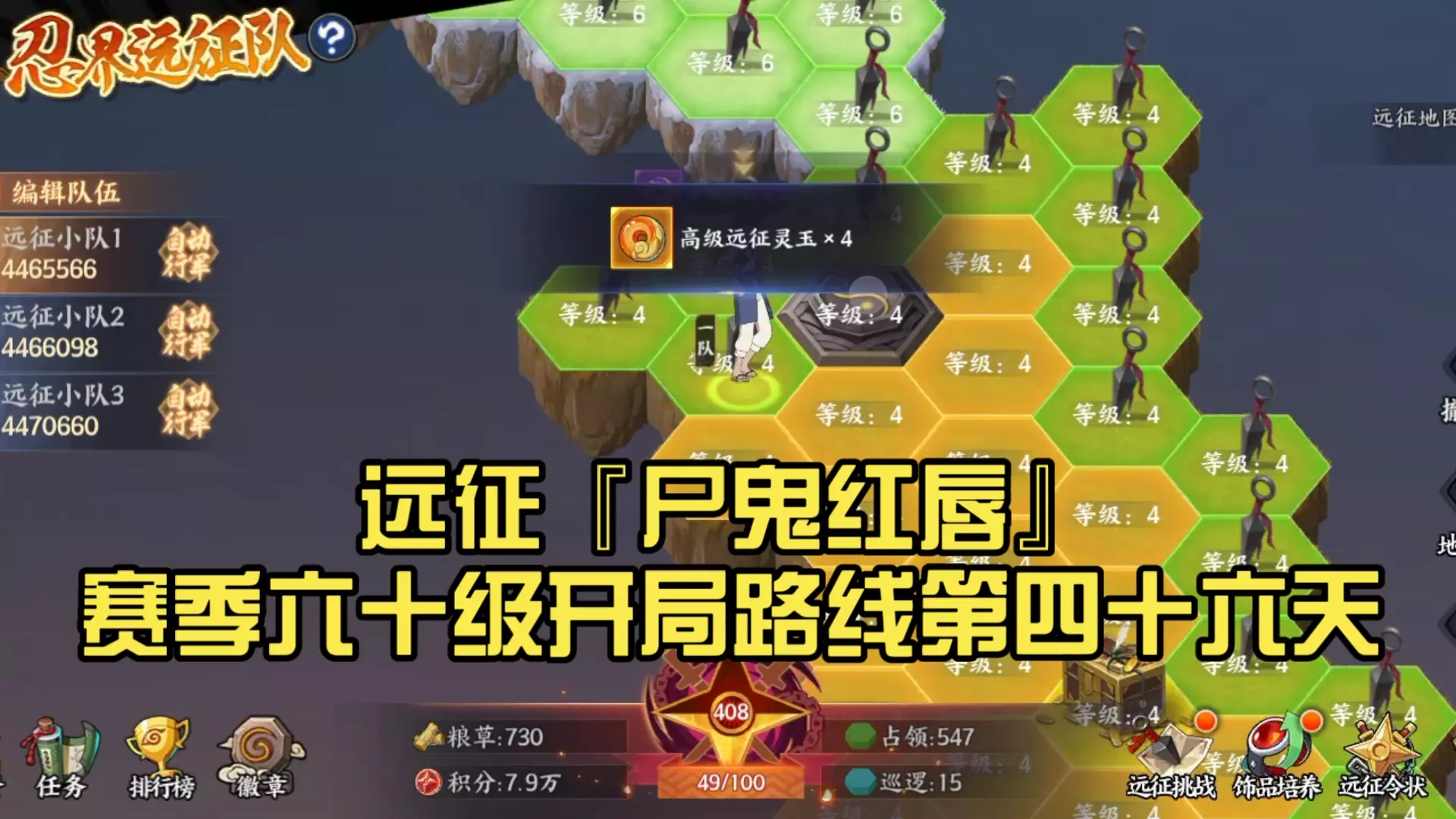这是《忍者远征队》“尸鬼红唇”赛季的作业分享,展示了六十级开局路线第45天的游戏进程,包含远征小队的行军、地块探索、布阵挑战等内容,还呈现了探索获得的奖励。