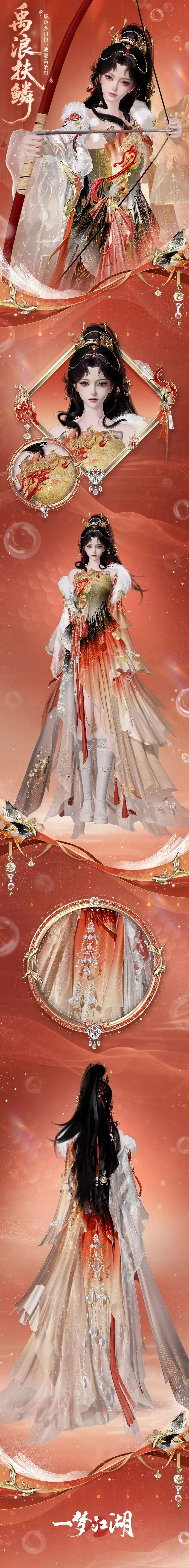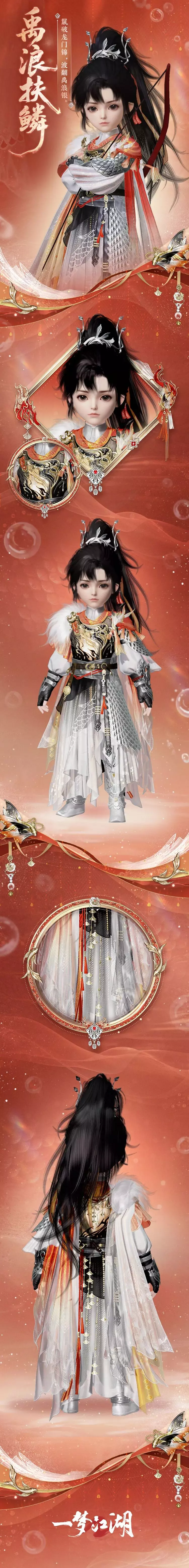 胸前金焰纹与银鱼尾交织,腰侧悬一枚玲珑金鲤逐珠坠,珠光流转间宛若衔住了一线破浪的星光。长靴紧束,踏地生风,既有江湖儿女的利落,又藏龙鲤璀璨。