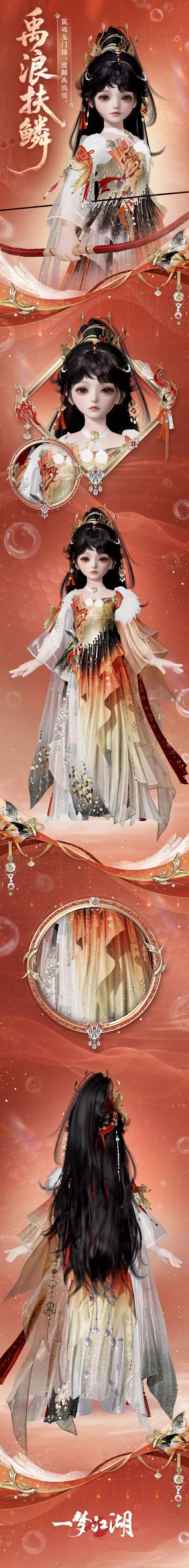 时装·万恒沙以丝绸古道上的时间史诗为灵感,将大漠流沙、星轨移转织入衣袂。时装·禹浪扶鳞则取意“龙鲤跃渊”,以玄金为渊、赤焰为魂。