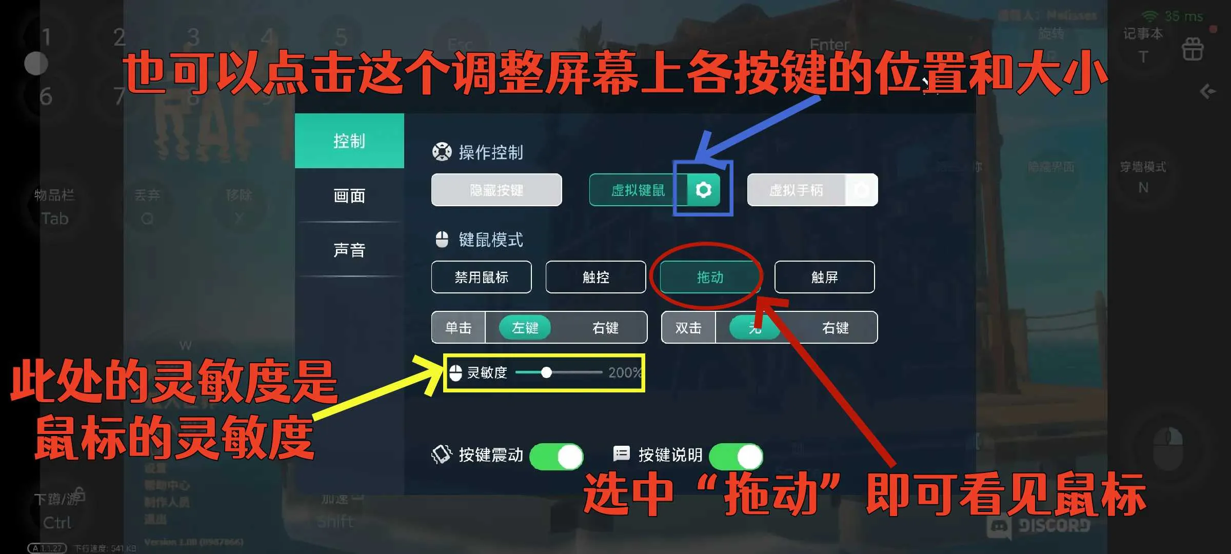 此外,如果觉得拖动鼠标移动的时候太慢,可以调高灵敏度(下图中黄色的方框)增加拖动鼠标移动的速度
