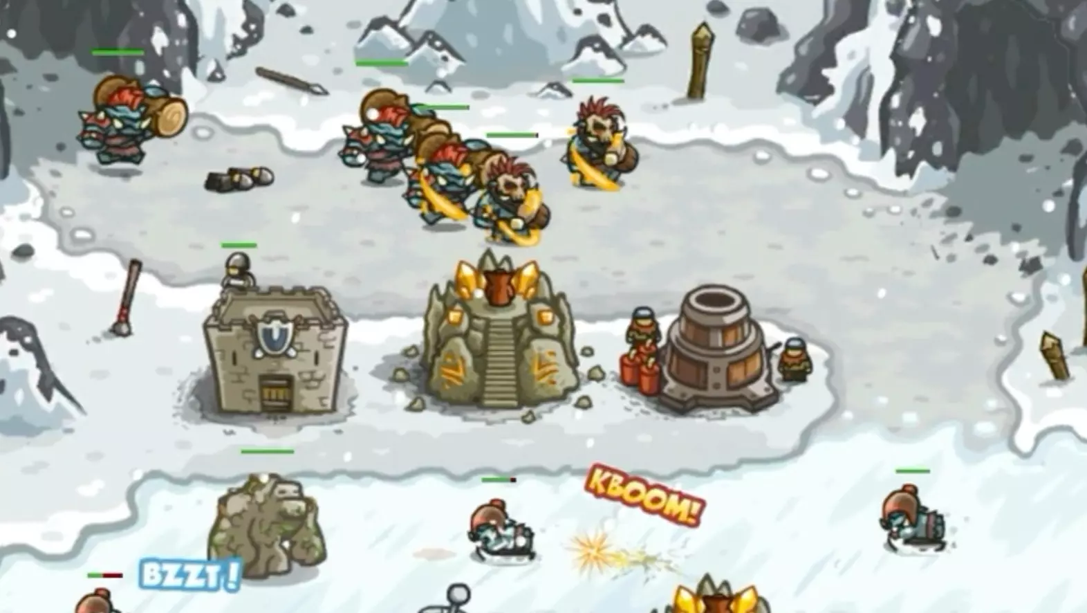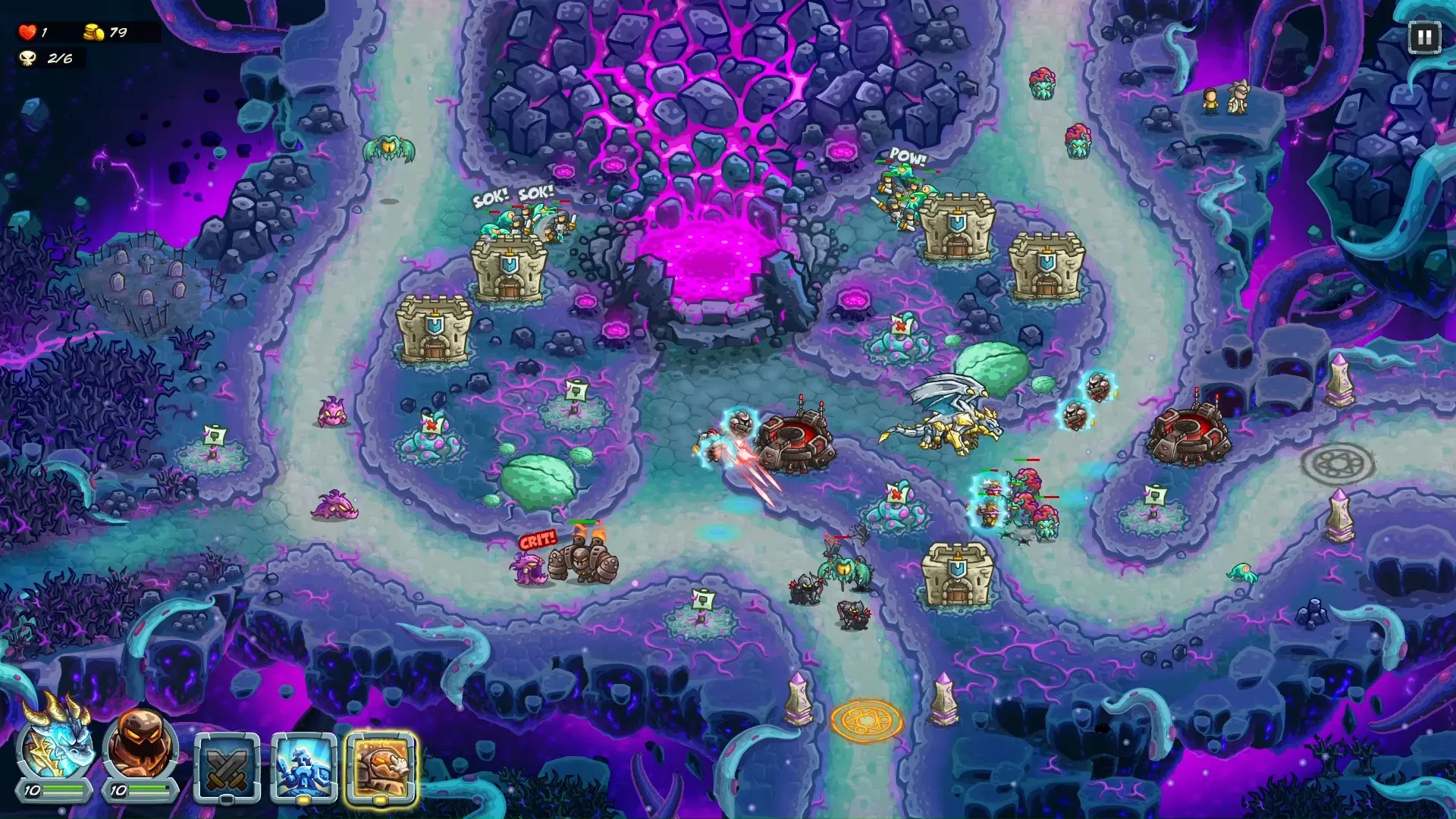 这是《皇家守卫军》的趣味挑战内容,玩家尝试在不建造防御塔,仅使用全部英雄的情况下,在高难度模式中挑战击败维兹南,展示了战斗过程中的多波次对战场景。