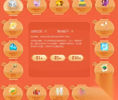 玩家通过掷骰,可以获得相应的道具和积分,可以一直循环投掷。每次投骰需要一个骰子。每个格子有物品和积分。运气爆棚的玩家可以抽到月光化雪/华美宫宛(永久)哦 全服超幸运 活动期间。所有玩家每累积投出666666点,每位付费玩家可以多获得一次骰子(每个Q号限制领取30次)