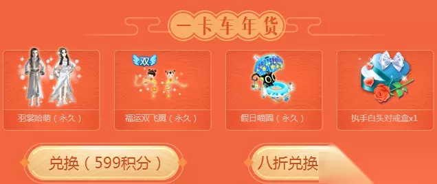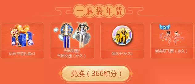366积分可以兑换一麻袋年货:幻彩中型礼盒X1、光辉男爵/气质女爵(永久)、荡秋千(永久)、新春双飞翼(永久)
