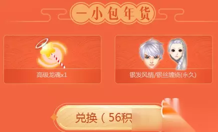 56积分可以兑换一小包年货:高级龙魂X1、银发风情/银丝缠绕(永久)