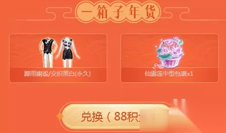 88积分可以兑换一箱子年货:朦雨幽谧/交织黑白(永久)、仙露莲中型包裹X1