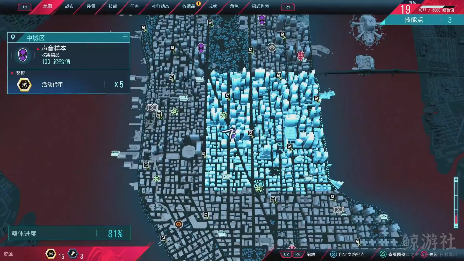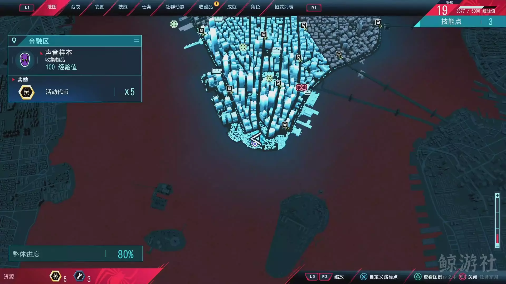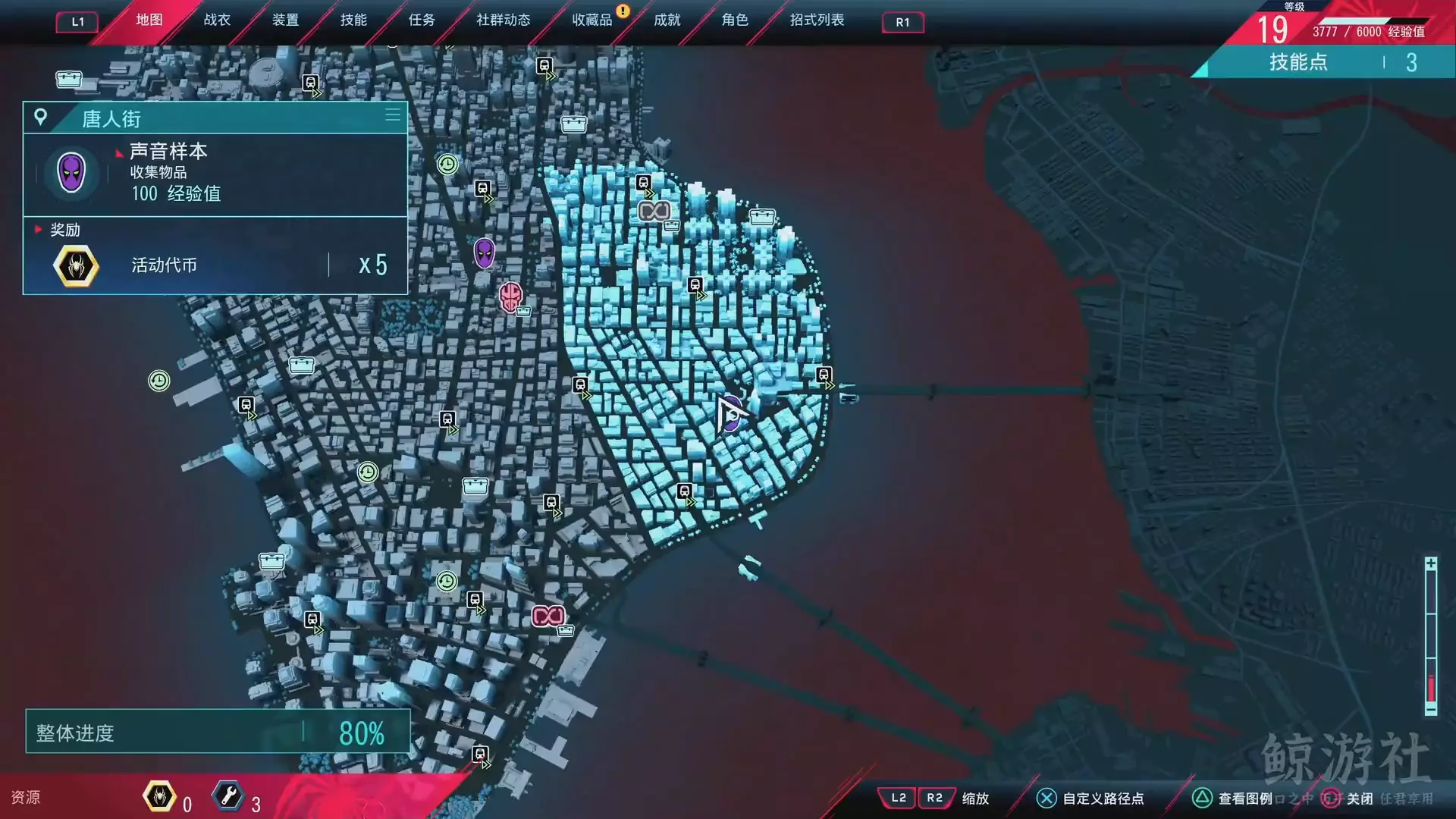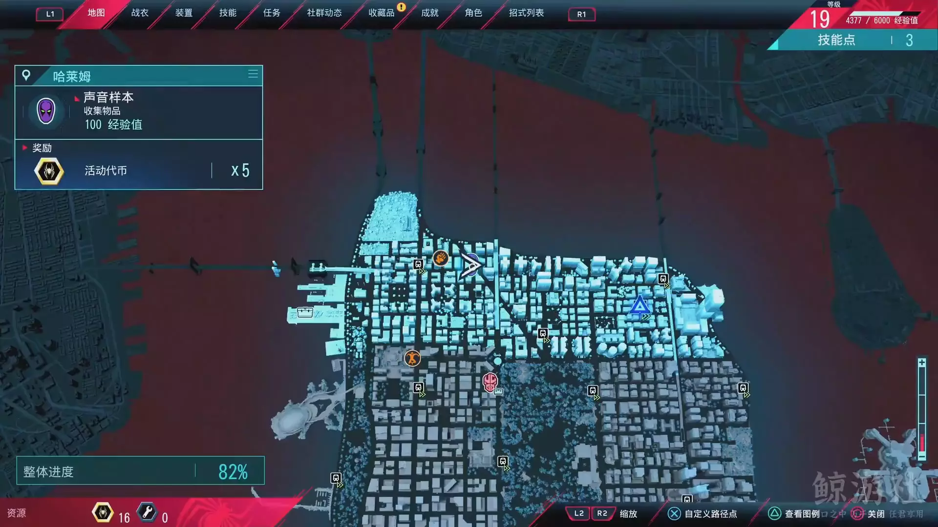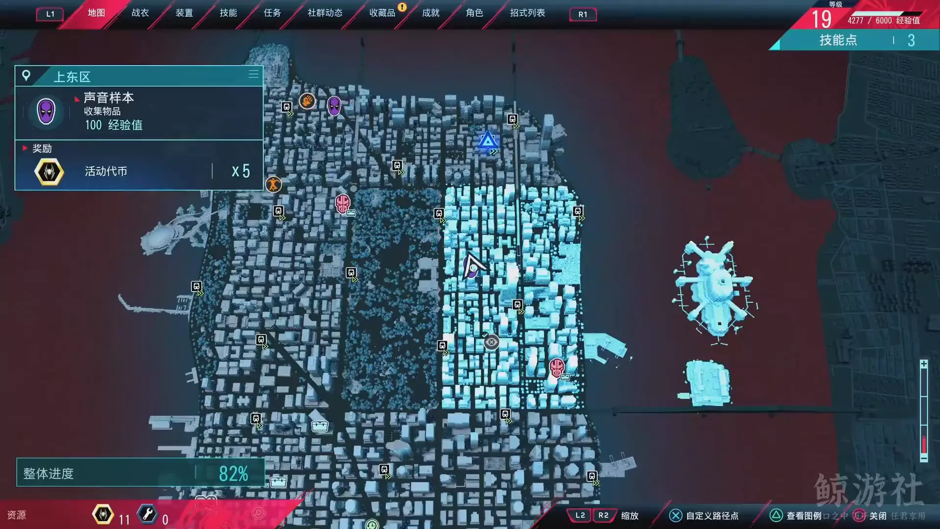 这是B站鲸游社分享的《漫威蜘蛛侠:迈尔斯》格林尼治村教堂钟声声音样本收集内容,展示了在格林尼治村寻找该声音样本的过程,完成收集可获得100经验值与5个活动代币。