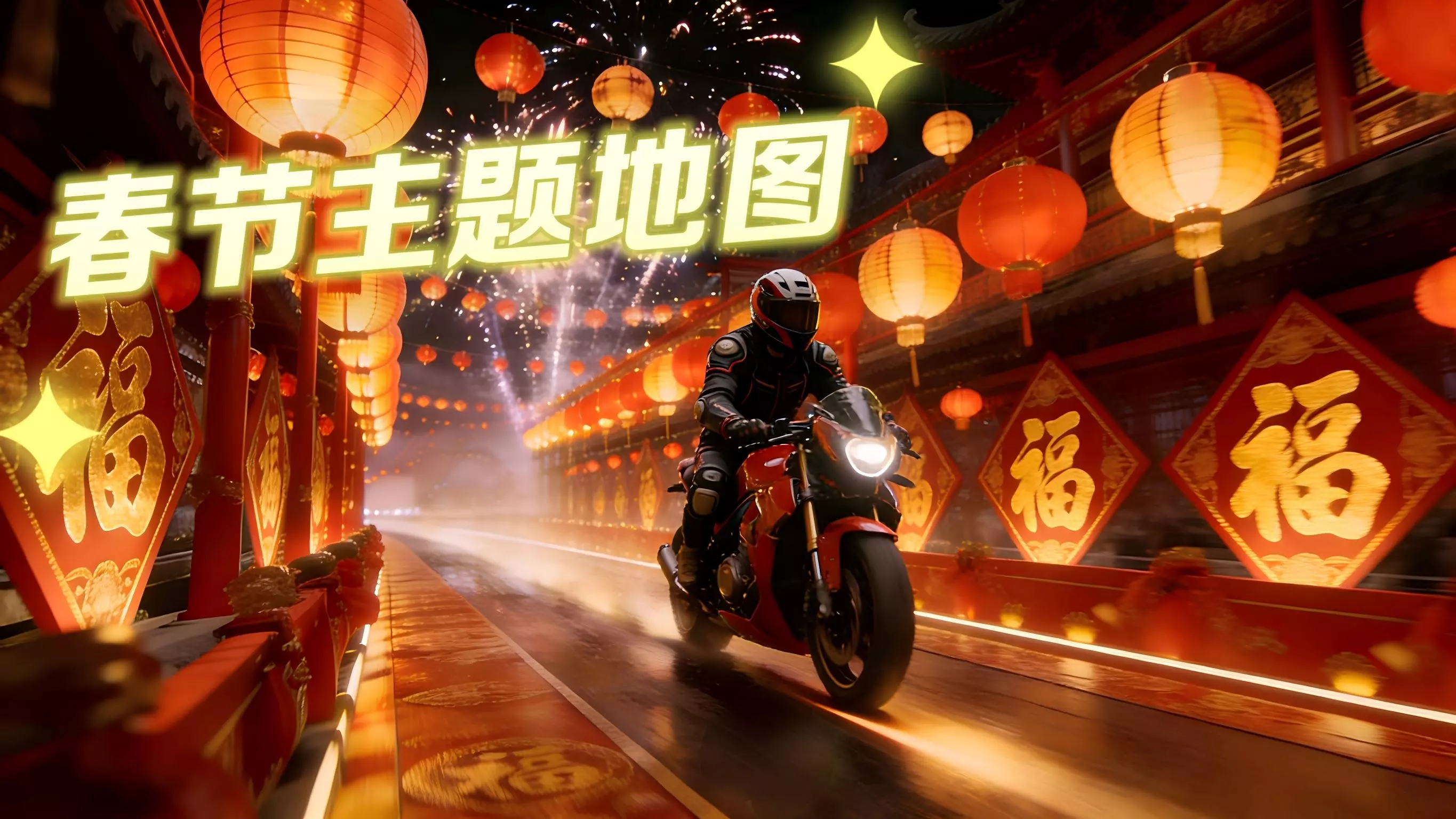 游戏地图全面穿上“新年装扮”,张灯结彩,烟花绽放,骑进每一个角落都是满满的节日气息!