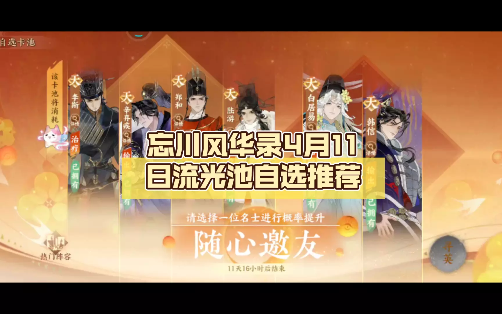 4月11日自选池推荐 首先说结论:没白优先白,没郑和优先郑和,两个都有就补白星星,其他较弱看兴趣抽取 1,辛弃疾:定位输出,强度感人,输出五废之一要输出没输出,…