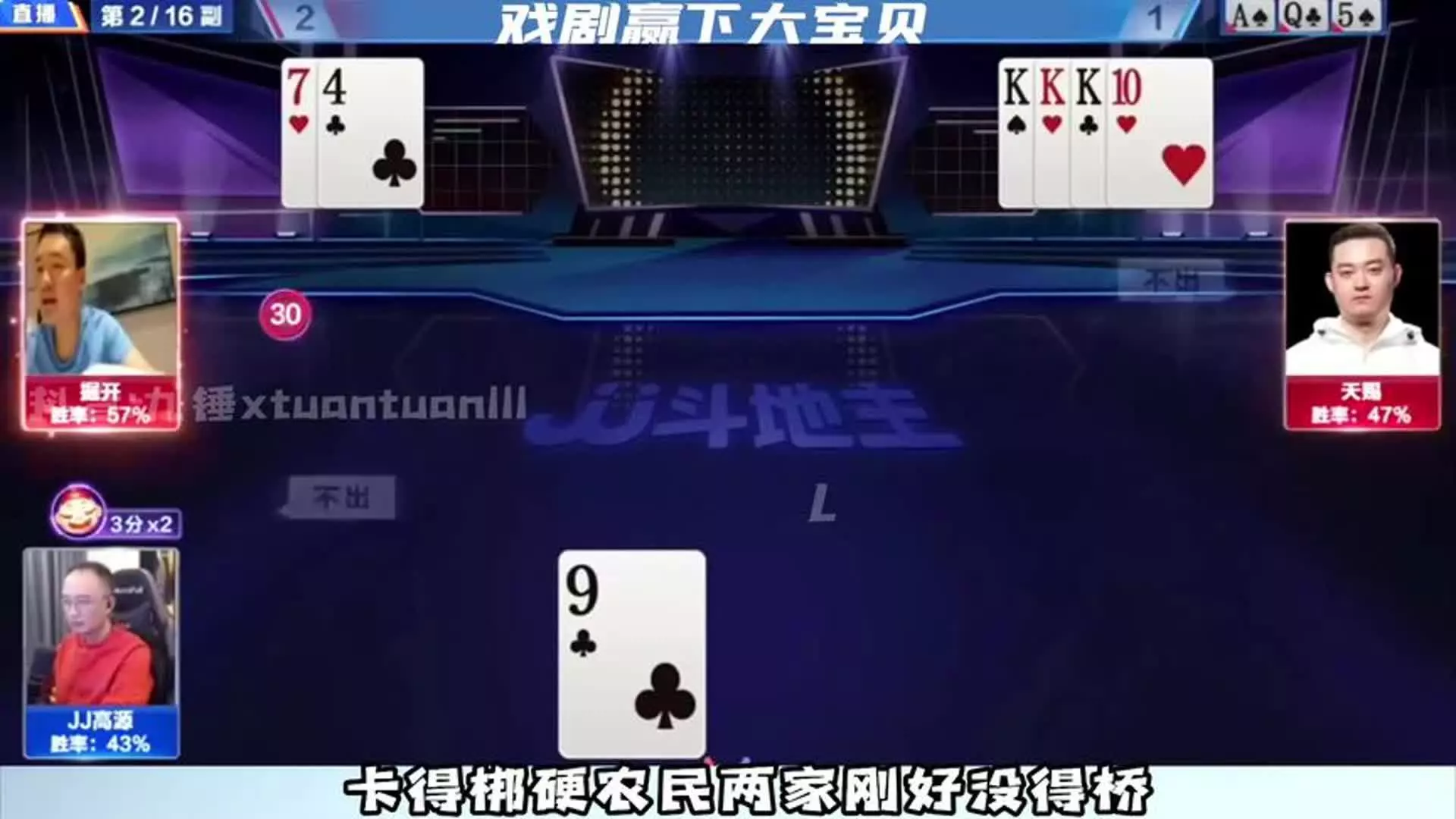 这是JJ斗地主双骄杯的赛事内容,展示了掘开、四条、老兵选手间的对局,呈现了斗地主比赛中的牌局战况与选手牌型,属于JJ斗地主的精彩对局内容。