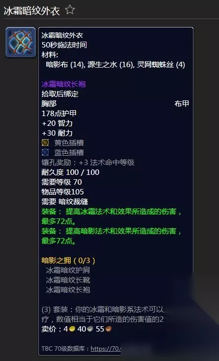 在游戏《魔兽世界怀旧服》中,冰霜暗纹套装所需的材料包括469个灵纹布、52个奥术之尘、26个原生暗影、26个原生火焰、38个源生之水、8个灵网蜘蛛丝。 其中冰霜暗纹长靴需要8个暗影布、12个源生之水、2个灵网蜘蛛丝。冰霜暗纹外衣需要14个暗影布、16个源生之水、4个灵网蜘蛛丝。冰霜暗纹护肩需要4个暗影布、10个源生之水、2个灵网蜘蛛丝。 1个暗影布=1个魔化灵文布卷、1个原生暗影、1个原生火焰。1个魔化灵文布卷=3个灵纹布卷、2个奥术之尘。1个灵纹布卷=6个灵纹布。