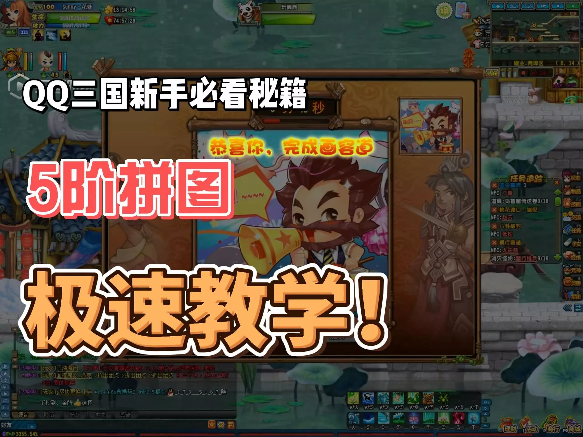 这是《QQ三国》玩家的第83天定投记录,玩家每日充值66元,目标一年拿下合肥。本次分享了简单的拼图笨方法,还展示了106级天威唤灵角色信息、装备,以及游戏内交易、四海货栈道具、经验加成等游戏内容。