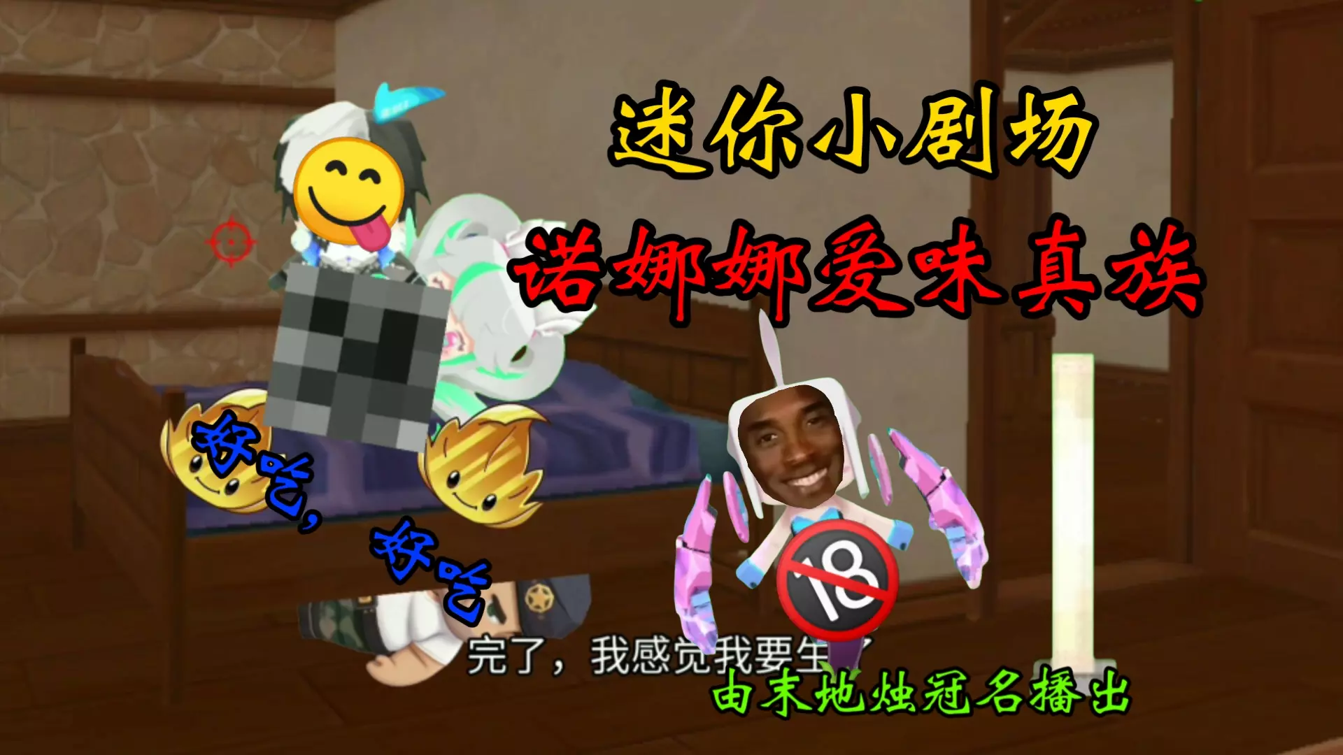 这是迷你世界玩家创作的官方结局彩蛋迷你小剧场,内容为玩家创作的趣味剧情,在石屋场景内,角色逼问被悬挂的角色,被悬挂角色将事情推给诺娜娜,是很有意思的迷你世界同人剧情内容。
