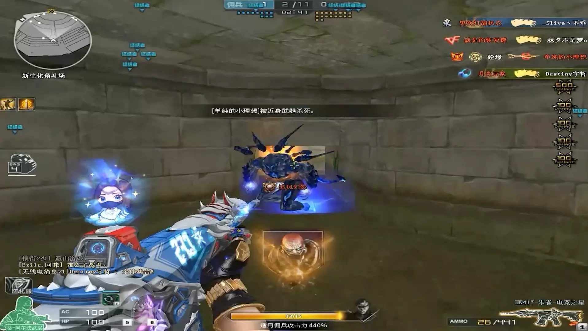 这是一组《穿越火线》新生化角斗场模式的游戏画面,展示了玩家分别以幽灵、佣兵身份参与对战的场景,能看到变异宝贝、迷你生化手雷等游戏道具的使用,呈现了该模式的战斗过程。