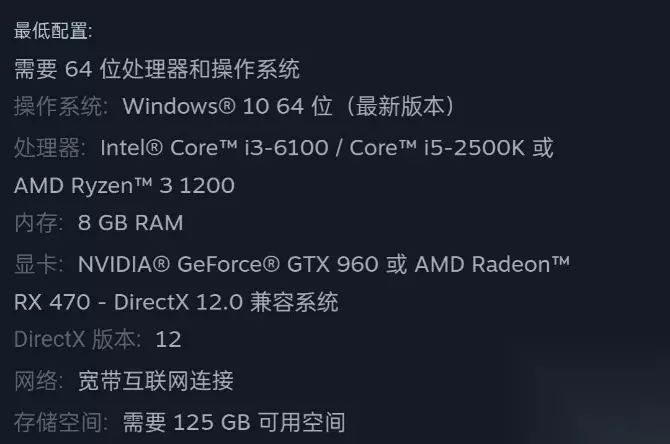 最低配置: 操作系统:Windows 10 64bit(最新更新版本) CPU:英特尔酷睿 i3-6100 或 AMD Ryzen 3 1200 显卡:GTX 960 或 Radeon RX 470 显存:2GB 内存:8GB 硬盘容量:125GB