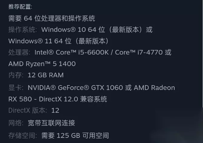 推荐配置: 操作系统:Windows 10 64bit 或 Windows 11 64bit(最新更新版本) CPU:英特尔酷睿 i5-6600K 或 AMD Ryzen 5 1400 显卡:GTX 1060 或 Radeon RX 580 显存:4GB 内存:12GB 硬盘所需容量:125GB