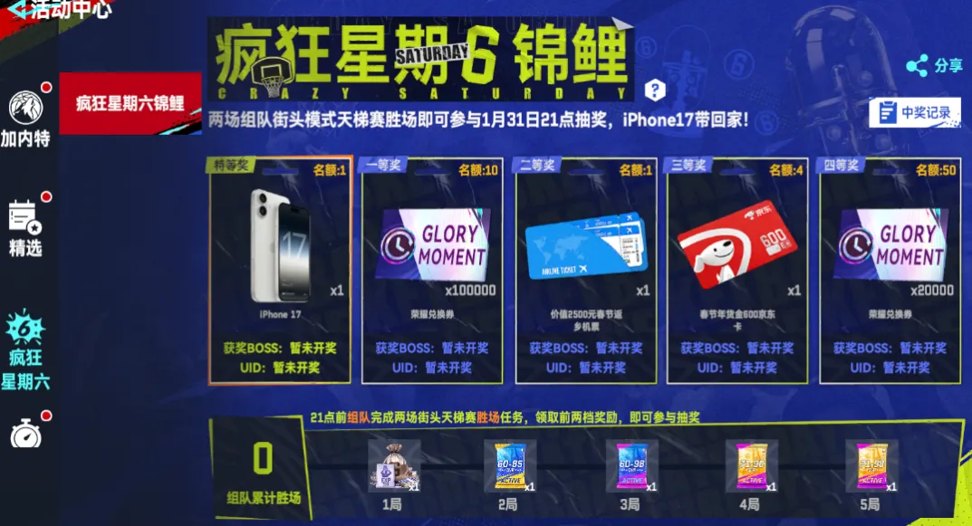 1月31日当天完成2场组队街头天梯赛胜利(好友组队/大厅邀请),领取完前两档奖励,即可参与抽奖!