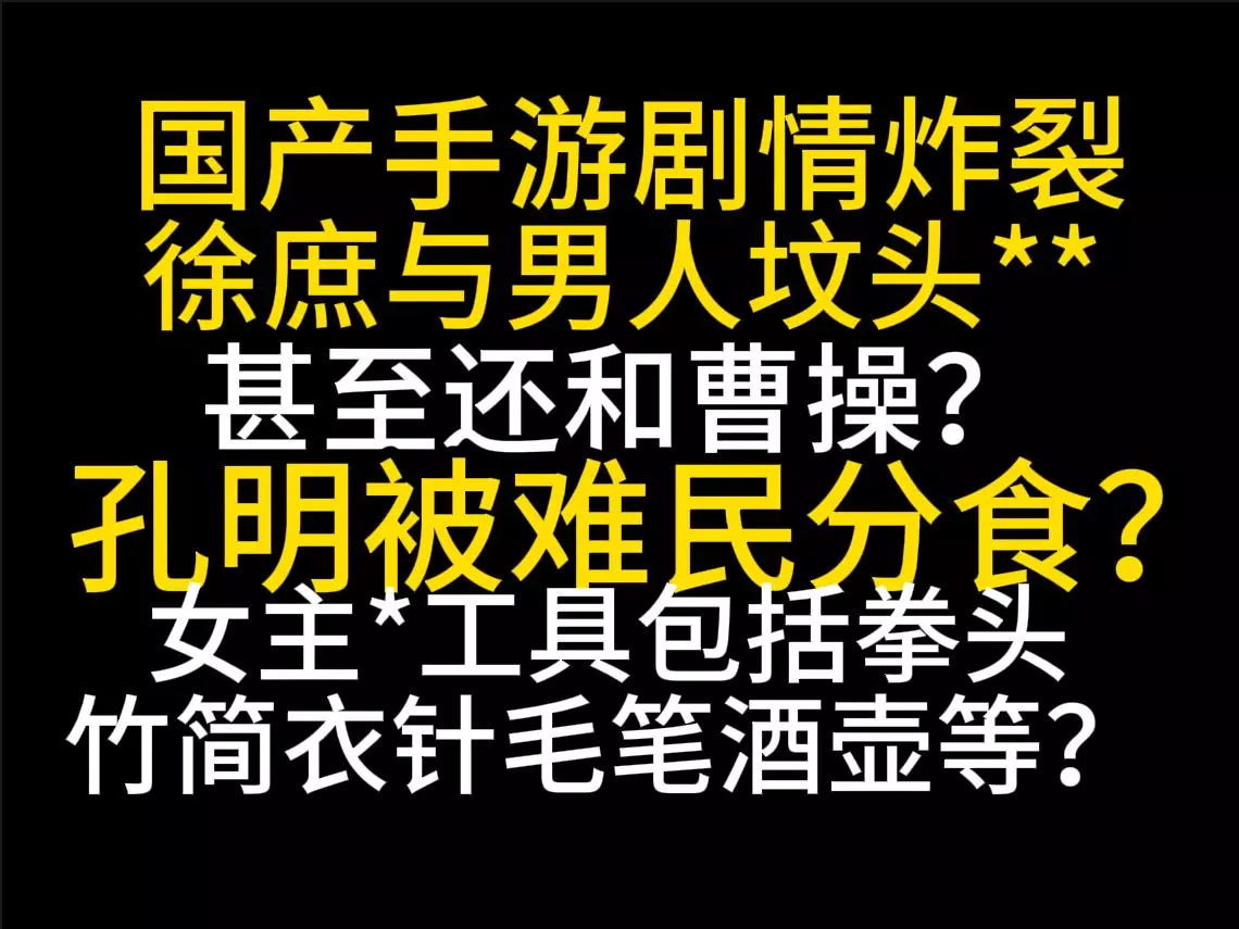 徐庶与男人坟头**甚至可能还和曹操?孔明被难民分食?拳头和竹简塞都是女主的工具?这就是国宴啊老师! 前面那期已经播放量30W的视频被代号鸢的公关以美术资源侵权为…