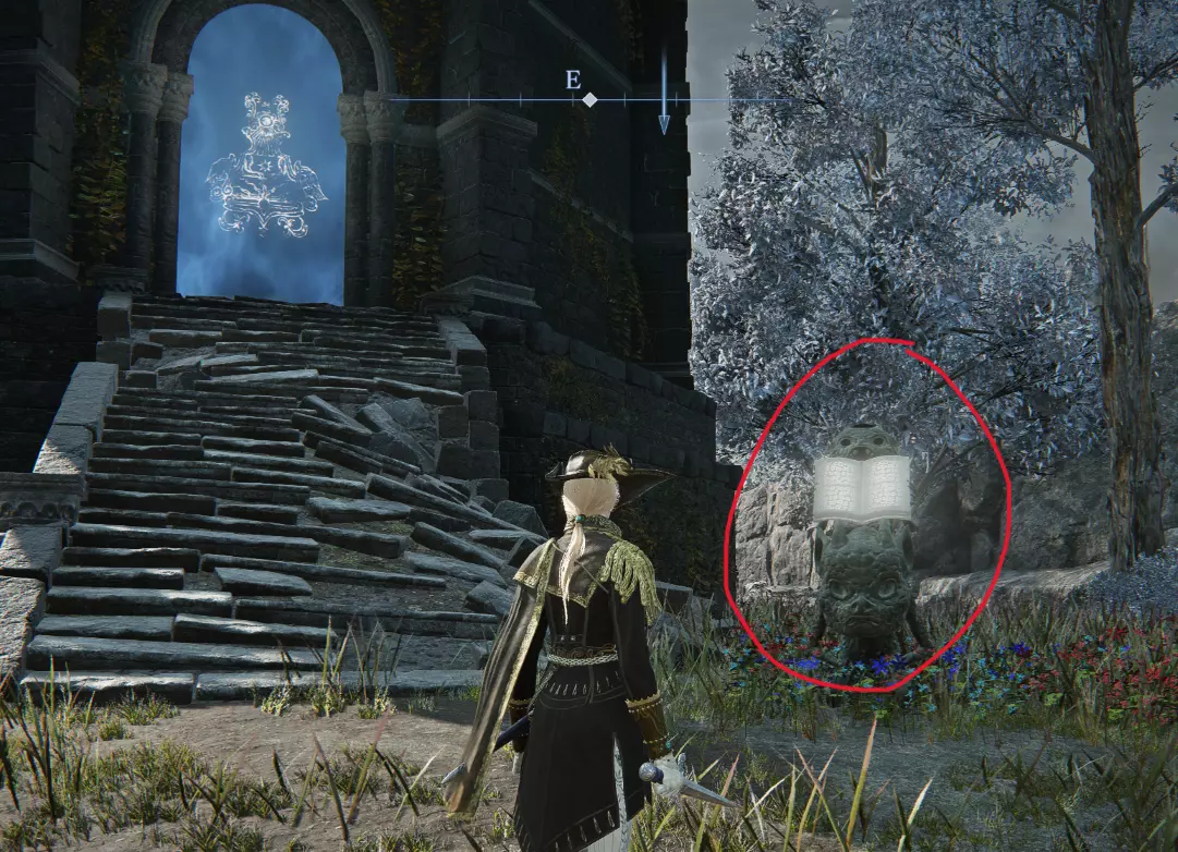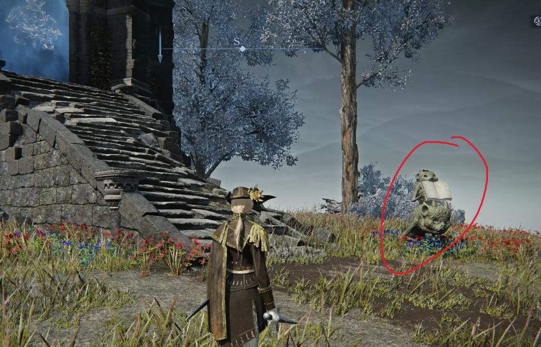 塔前(9-11) 塔前的顶峰有三个可能的位置。 9.小鬼雕像,带打开的书,隐藏的徽章 如果塔前有一个小鬼雕像拿着一本打开的书,打它以露出一个顶峰。