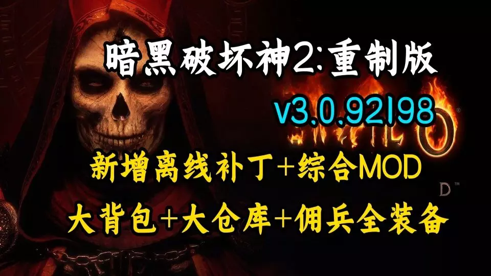 这是4月更新的《暗黑破坏神2》重制终极整合版v3.0.92198,包含离线补丁、带大背包大仓库等功能的新综合MOD,还有新手BT开荒装备、全符文、护符开荒等存档,助力玩家体验游戏。