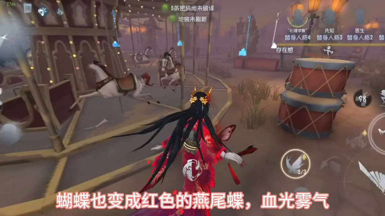 这是《第五人格》的游戏内容,玩家飞莎儿使用红蝶胧夜,搭配推荐挂件进行对局,凭借红蝶的技能优势完成四抓,展示了红蝶的实战强度与挂件的实用效果。