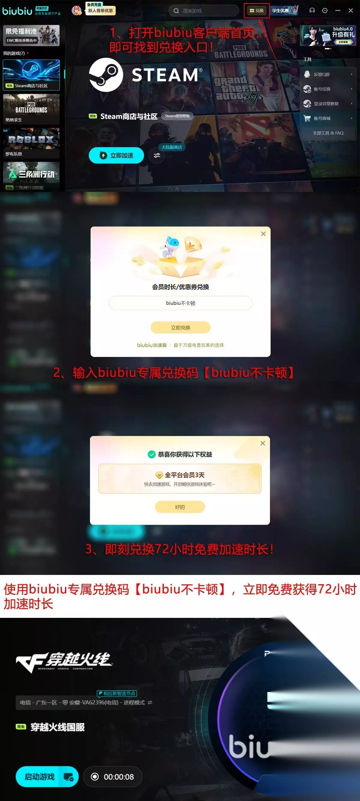 新用户注册biubiu加速器,它也是诚意满满,专为刚上手的cf伙伴们准备的通关通行证,只要你是首次注册biubiu加速器的新朋友们,就能立刻开启这份专属惊喜,直接解锁24小时免费加速时长,作为陪你闯荡新手期的见面礼,还有加码福利等待解锁,输入兑换码【biubiu不卡顿】,就能额外领取72小时免费加速时长,两个一共高达96小时的免费加速权益,不用充值,不需要等待,一键加速直接畅通无阻。技术大家也完全不用担心,biubiu加速器依靠阿里巴巴灵犀互娱大厂,技术安全有保障,大家可放心冲!
