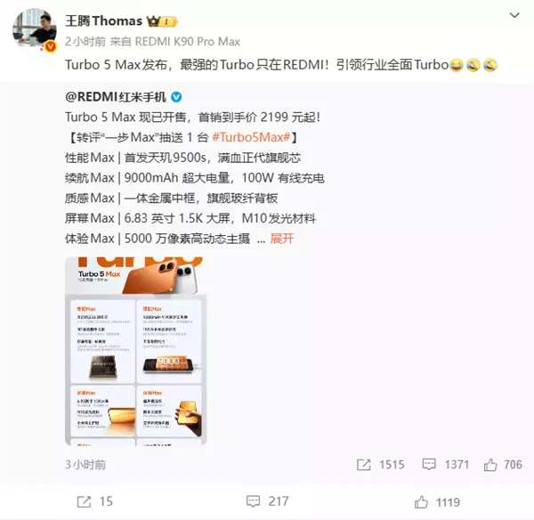 快科技1月29日消息,今日,REDMI Turbo 5系列正式发布,起售价1999元。新机发布后,前REDMI品牌总经理王腾转发REDMI手机微博,为Turbo 5系列进行宣传。王腾在转发中表示:“Turbo 5 Max发布,最强的Turbo只在REDMI!引领行业全面Turbo。”