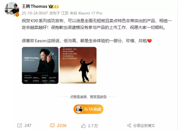 据了解,尽管已离开小米,王腾此前仍多次转发小米相关微博。例如在REDMI K90系列发布时,王腾曾发文祝贺K90系列成功发布,并称该代产品升级幅度较大,在内存持续涨价背景下,价格已经很厚道。
