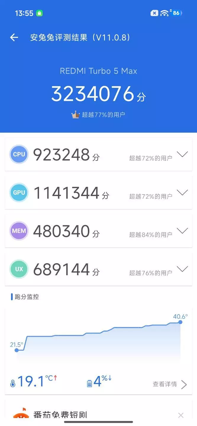 室温场景下,红米REDMI Turbo 5 Max在安兔兔V11跑分为3234076,其中CPU分数为923248分,GPU分数为1141344分,MEM分数为480340分,UX分数为689144分。虽然和宣传的分数略有差距,但考虑到实验室环境和常温环境的差异,倒也正常,并且这个分数本身已经高于目前市面上所有的天玑9400+机型了。